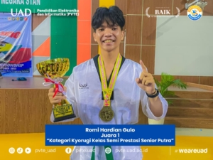 Tangerang Selatan- Mahasiswa Program Studi Pendidikan Vokasional Teknik Elektronika (PVTE) Fakultas Keguruan dan Ilmu Pendidikan (FKIP) Universitas Ahmad Dahlan (UAD), Romi Hardian Gulo, kembali menorehkan prestasi membanggakan. Ia berhasil meraih Juara 1 (Medali Emas) dalam Kategori Kyorugi Kelas Semi Prestasi Senior Putra pada ajang Bang Taja Taekwondo Championship 2025.