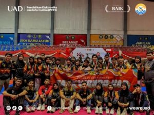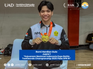 Yogyakarta, 2 September 2025 – Prestasi membanggakan kembali ditorehkan oleh mahasiswa Program Studi Pendidikan Vokasional Teknik Elektronika (PVTE) Universitas Ahmad Dahlan. Romi Hardian Gulo berhasil meraih Juara 1 (Medali Emas) pada kategori Kyorugi Kelas Festival Senior Putra dalam ajang bergengsi Kejuaraan Nasional Indonesia Expo Battle Taekwondo Championship 2025 Piala DPR RI.
